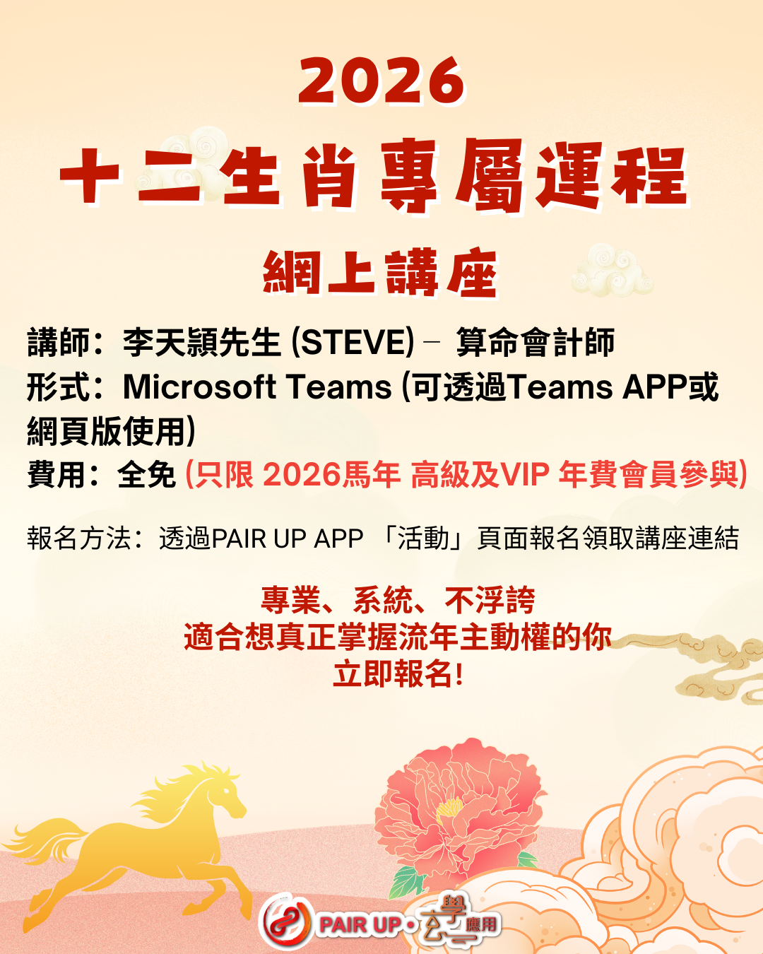 費用全免!只限PAIR UP高級及 VIP 年費會員。立即上PAIR UP APP 「活動」頁面報名領取講座連結~